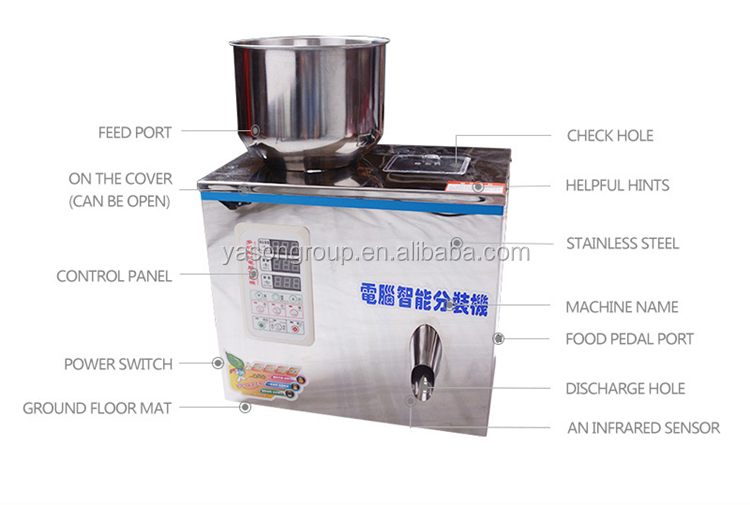 Stainless Steel InletTo packing weighing of the product in the hopper ,the first step in automatic weighing.Transparent visual mouthTransparent design , it is more convenient to observe . work status can be clearly observed.Operation panelOriginal intelligent computer motherboards , high precision long service life , easy operation ,flexible and convenient and efficient.An infrared sensor Discharging mouth using infrared sensor design , hand close to the material came out ,a stable machine automatically the next time .Foot switch Connect the pedal switch interface , can be used under the foot switch control , control ability is stronger,more flexible to operate.The power switchHigh quality power supply interface ,durable. Please put the machine smoothly, power strip, please be sure to ground wire .